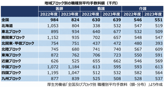 2023年度の地域ブロックごとの状況をみると、南関東だけが医師、看護、介護のいずれも平均手数料額が減少しました。また、北陸と近畿では、看護の平均手数料額が医師の平均手数料額より高い状況です。
